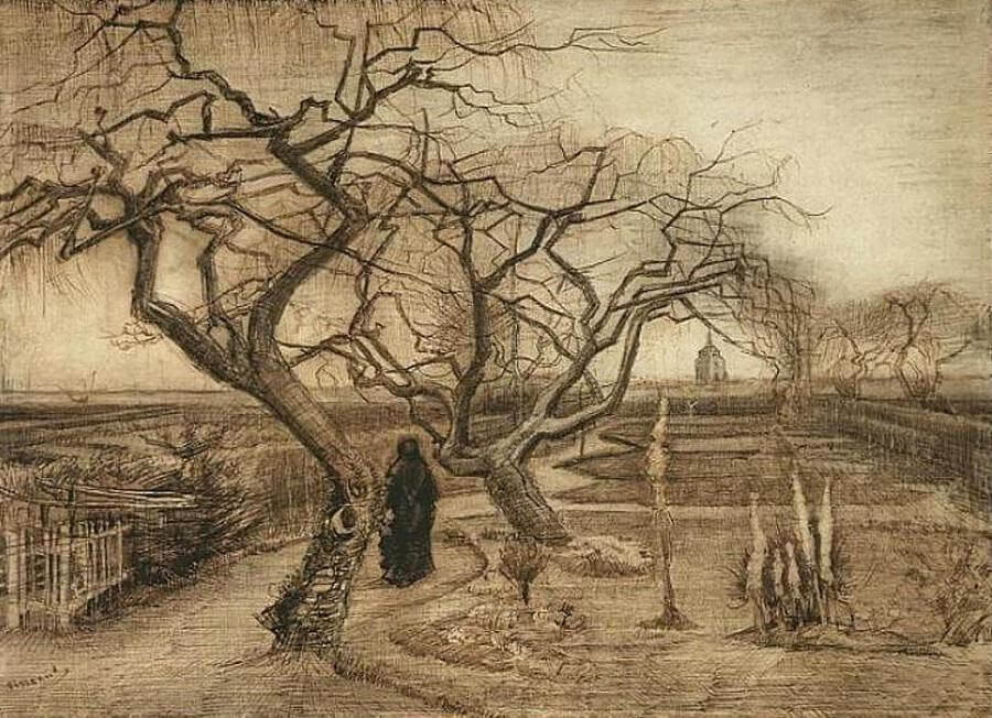 Looking at the above sketch by Vincent van Gogh, one can easily stop at the signs that make up the picture: “It’s just a couple of dead trees in a field with a building in the background.” But notice how this description flattens the image by omitting everything about it that makes it an artwork rather than a diagram. Notice how it negates the encounter we sense when we apprehend the image as a singular creation instead of a generic representation. Art does not represent reality; it captures it from an oblique angle from which the object of perception, the act of perceiving, and the power of the percept reveal their strange unicity. Through symbols, the work of art forces us to see the world imaginally—which is to say, not in terms of fixed representations illuminated by the blinding light of intellect, but rather of moving spheres shifting in and out of shadow, bioluminescent, illumined from within. Van Gogh’s image casts its own light. There’s movement and change in it. It doesn’t show us dead things in dead space, but living forces in a sentient field.